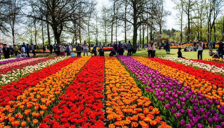 Spring is the best time to visit the Netherlands, when tulip fields stretch across the countryside in bright stripes of red, yellow, purple, and pink.