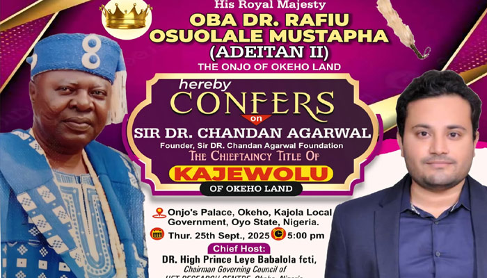 Lagos, Nigeria – September 25, 2025 – In a historic and culturally significant ceremony at the Onjo Palace, Okeho, His Royal Majesty Oba, Alayeluwa Dr. Mustapha Osuolale Adeitan II, installed Sir, Dr, Chief Chandan Agarwal as the KAJEWOLU OF OKEHO LAND.