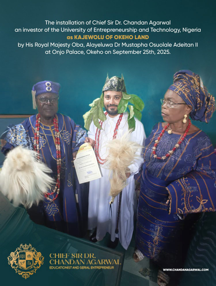Dr. Agarwal, an investor in the University of Entrepreneurship and Technology, Nigeria, has been instrumental in supporting educational innovation and fostering youth empowerment in Africa. His installation reflects not only the community’s respect for his contributions but also the growing synergy between India and Nigeria in the spheres of education, business, and cultural exchange.