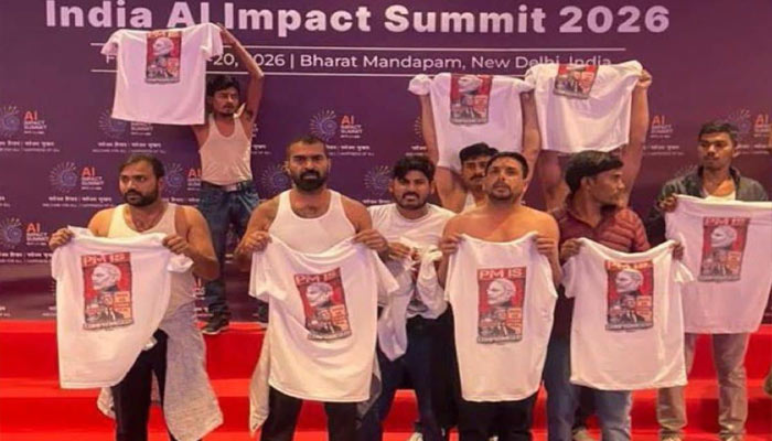 Four members of the Indian Youth Congress were arrested on Friday after staging a shirtless protest inside Bharat Mandapam in New Delhi, where the AI Impact Summit 2026 is currently underway.